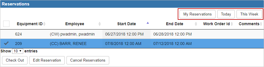 - From the Reservations panel, click My Reservations, Today, or This Week.